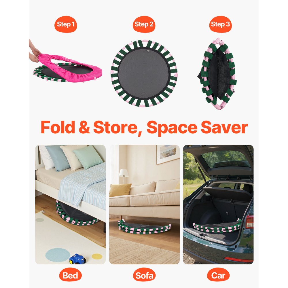 Almacenamiento rápido con diseño plegable: con un diseño de marco plegable, nuestro trampolín para niños para interior y exterior ocupa solo una cuarta parte de su volumen original cuando está plegado, lo que hace que el almacenamiento sea fácil y ahorre espacio. Se puede guardar debajo de un sofá o en el maletero de un automóvil. El diseño plegable también hace que sea fácil de mover, lo que permite que los niños salten donde quieran.
