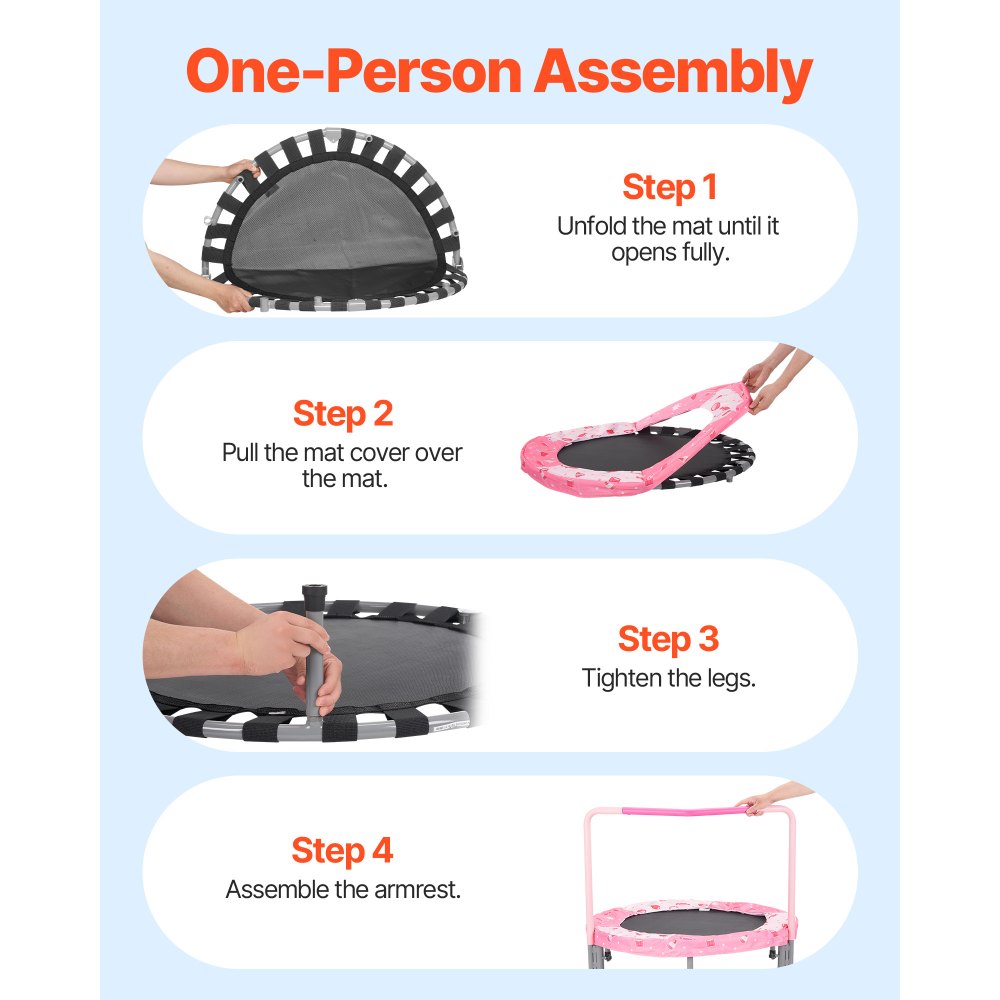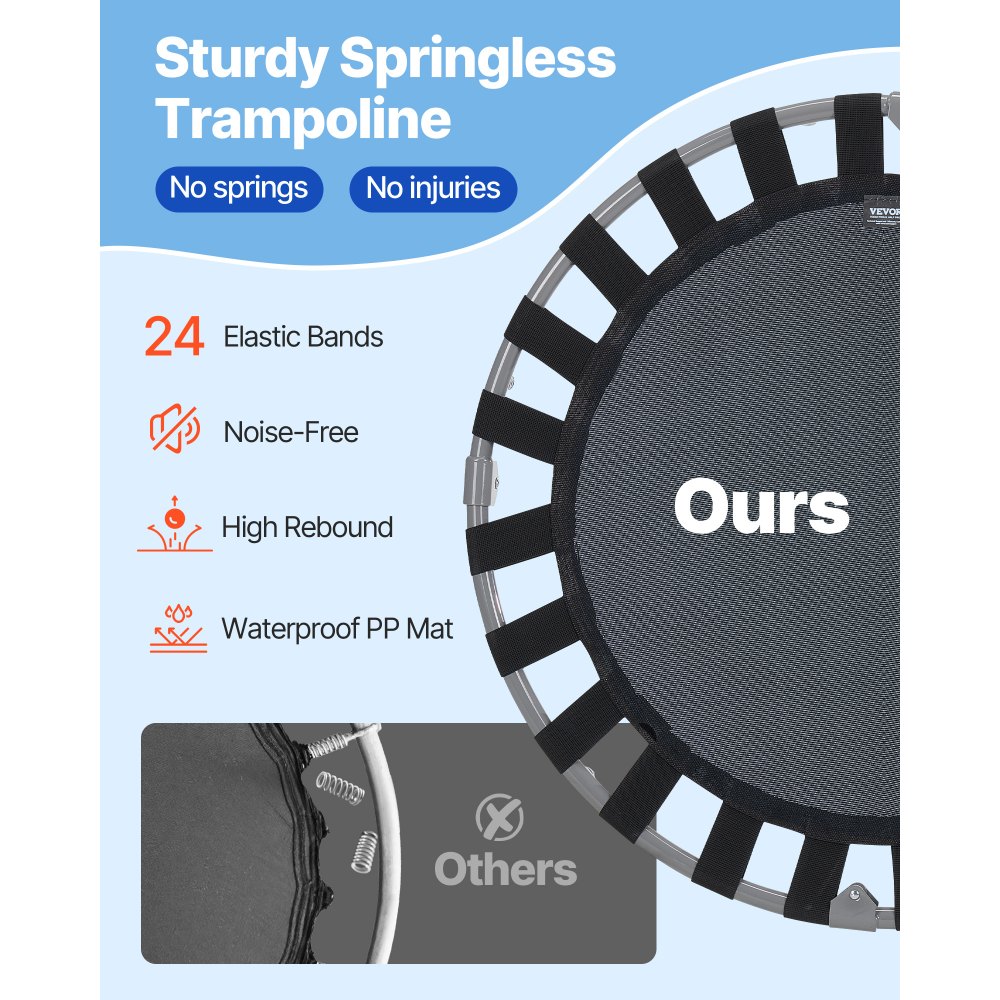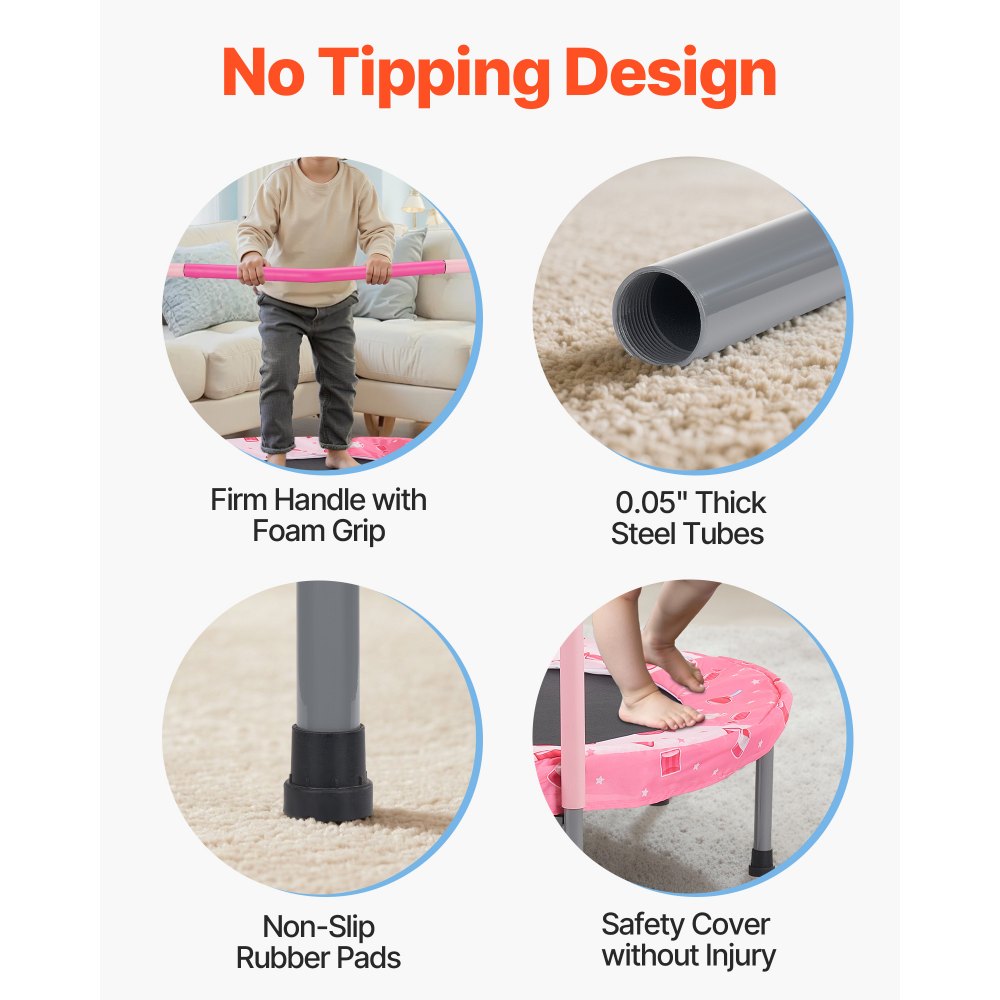Patas reforzadas: Construido con un marco resistente, una colchoneta de salto de polipropileno, cubiertas de almohadillas de seguridad, bandas elásticas planas, tubos de patas con punta de goma y manijas cubiertas de espuma, este mini trampolín para bebés y niños pequeños está diseñado para durar. Las patas reforzadas recientemente mejoradas resisten la flexión y la deformación, lo que garantiza una estabilidad sólida. Las almohadillas de goma para los pies brindan un rebote silencioso.
