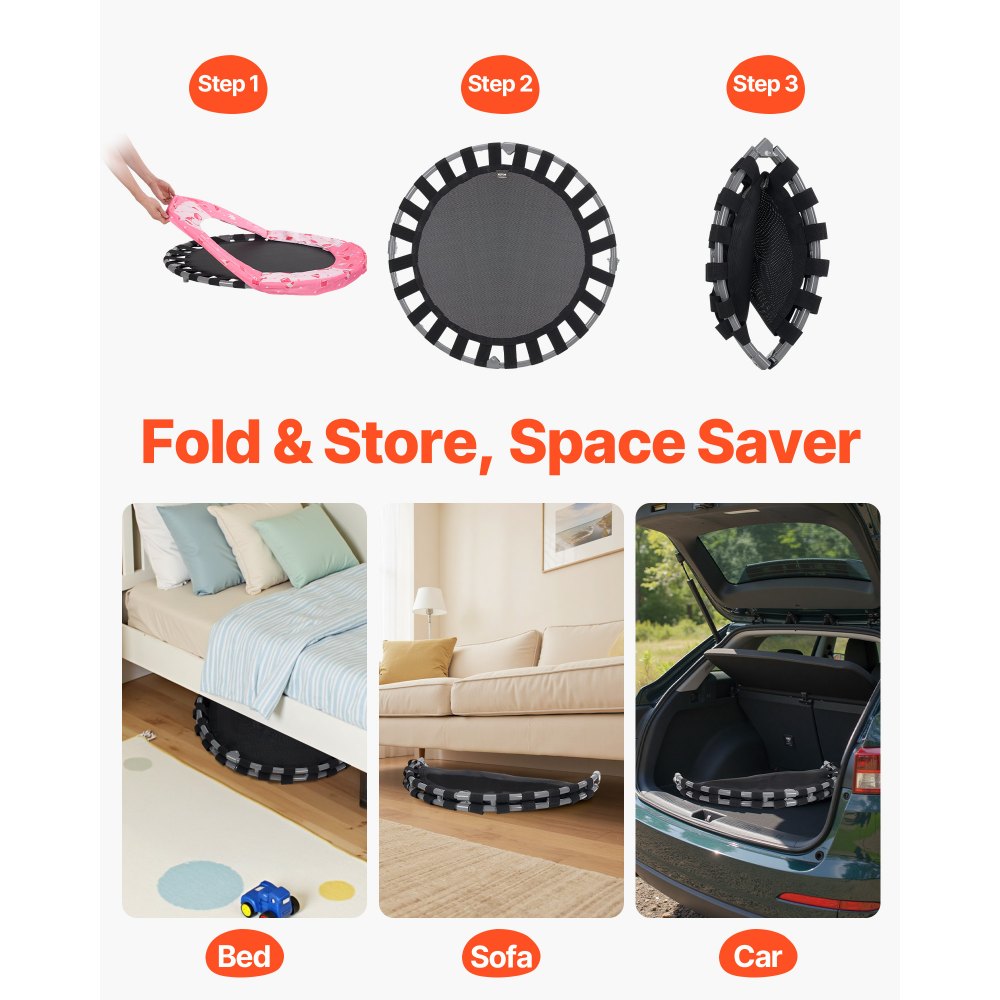Almacenamiento rápido con diseño plegable: Con un diseño de marco plegable, nuestro trampolín para niños para interior y exterior ocupa solo una cuarta parte de su volumen original cuando está plegado, lo que hace que el almacenamiento sea fácil y ahorre espacio. Se puede guardar debajo de un sofá o en el maletero de un automóvil. El diseño plegable también hace que sea fácil de mover, lo que permite que los niños salten donde quieran.