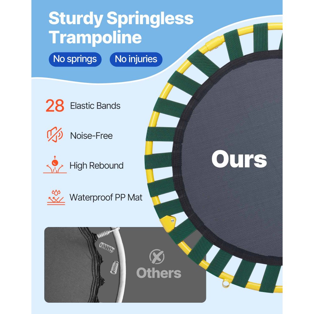 Ejercicio científico para el crecimiento: El trampolín VEVOR para niños de interior/exterior, diseñado específicamente para niños, ofrece una plataforma de 92 cm para hacer ejercicio. Mejora su condición física, resistencia y coordinación mientras se divierten, lo que la convierte en la actividad interior ideal para los niños. (Edad adecuada: mayores de 3 años, ¡no apto para niños menores de 36 meses!)
