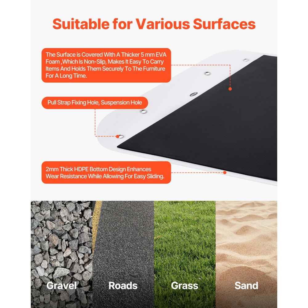 Construcción de doble capa: Fabricado con materiales de doble capa de PE y EVA. El PE ofrece una excelente resistencia al desgaste y al frío, mientras que la capa de EVA de 5 mm ofrece propiedades antideslizantes, lo que aumenta la fricción para proteger eficazmente los artículos durante el transporte. Nuestro trineo de patio para transporte es ideal para mover muebles, electrodomésticos y más