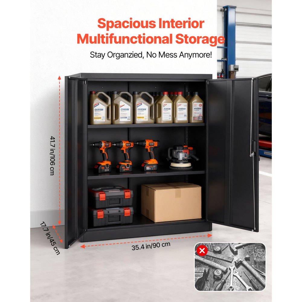 Armario de Almacenamiento Metálico de 3 Niveles para Garaje, con Estantes Ajustables, 2 Puertas Magnéticas y 2 Llaves, Apto para Despensa, Almacén y Sótano, Color Negro, 90 x 45 x 106 cm - Equipos de almacenamiento y manipulación