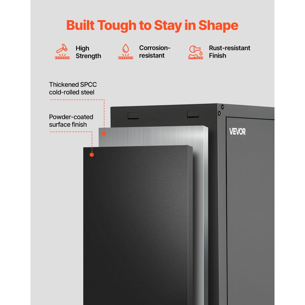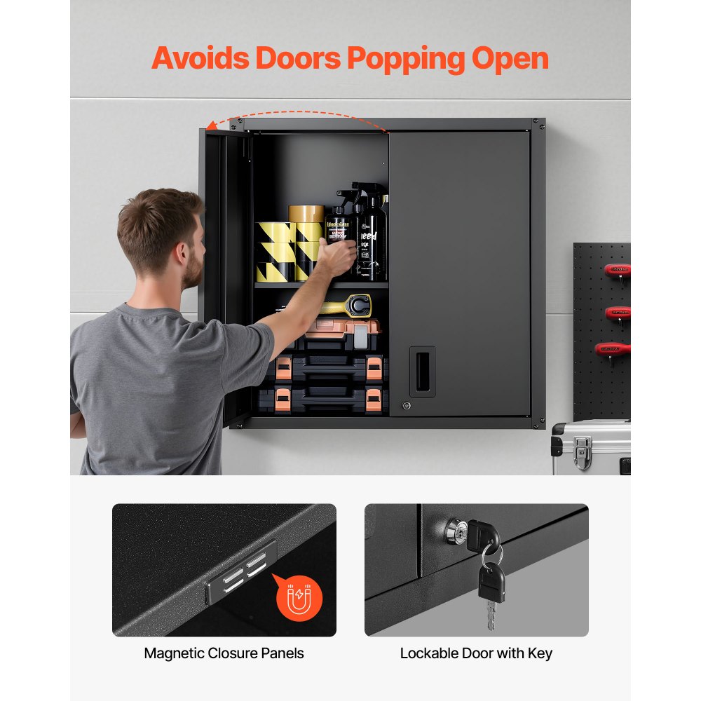 Puertas de fácil acceso: Las puertas laterales se abren para un acceso rápido. La cerradura del armario de pared metálico colgante mantiene los artículos seguros, mientras que los cierres magnéticos mantienen las puertas cerradas de forma segura