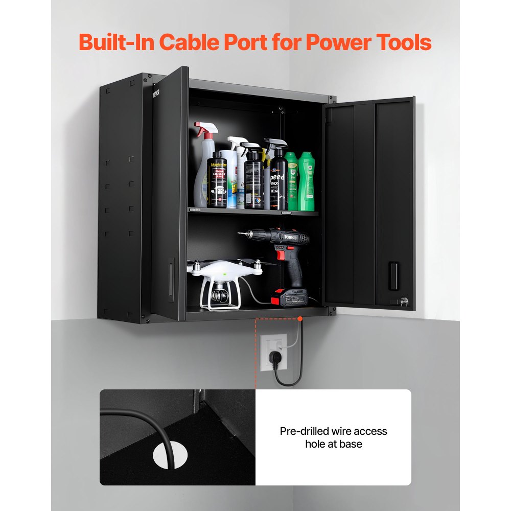 Orificio para cable incorporado: Un puerto para cable inferior perforado previamente en el gabinete de pared con cerradura mantiene los cables ordenados y permite cargar dispositivos en el interior, por lo que el almacenamiento se mantiene limpio mientras el equipo permanece encendido