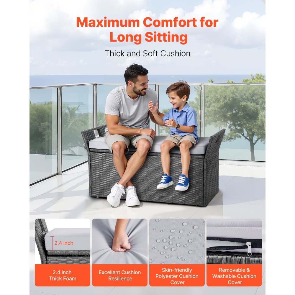 Cojín suave: Nuestro banco tipo cajón de terraza incluye un cojín suave de 6 cm de grosor con relleno de esponja de alta calidad para un asiento cómodo, incluso durante un uso prolongado. La funda del cojín está hecha de poliéster resistente, extraíble y lavable para una limpieza fácil