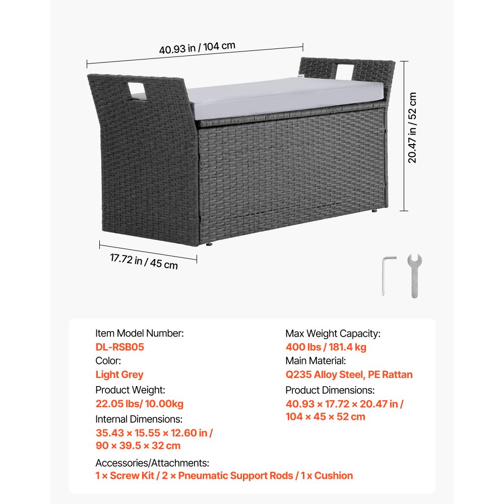 Banco de Almacenamiento de Ratán Sintético Baúl de Terraza 104 x 45 x 52 cm con Cojín y Asas Laterales Asiento Cómodo para 2 Personas Soporta hasta 181 kg para Exterior, Jardín, Balcón, Gris - Equipos de almacenamiento y manipulación