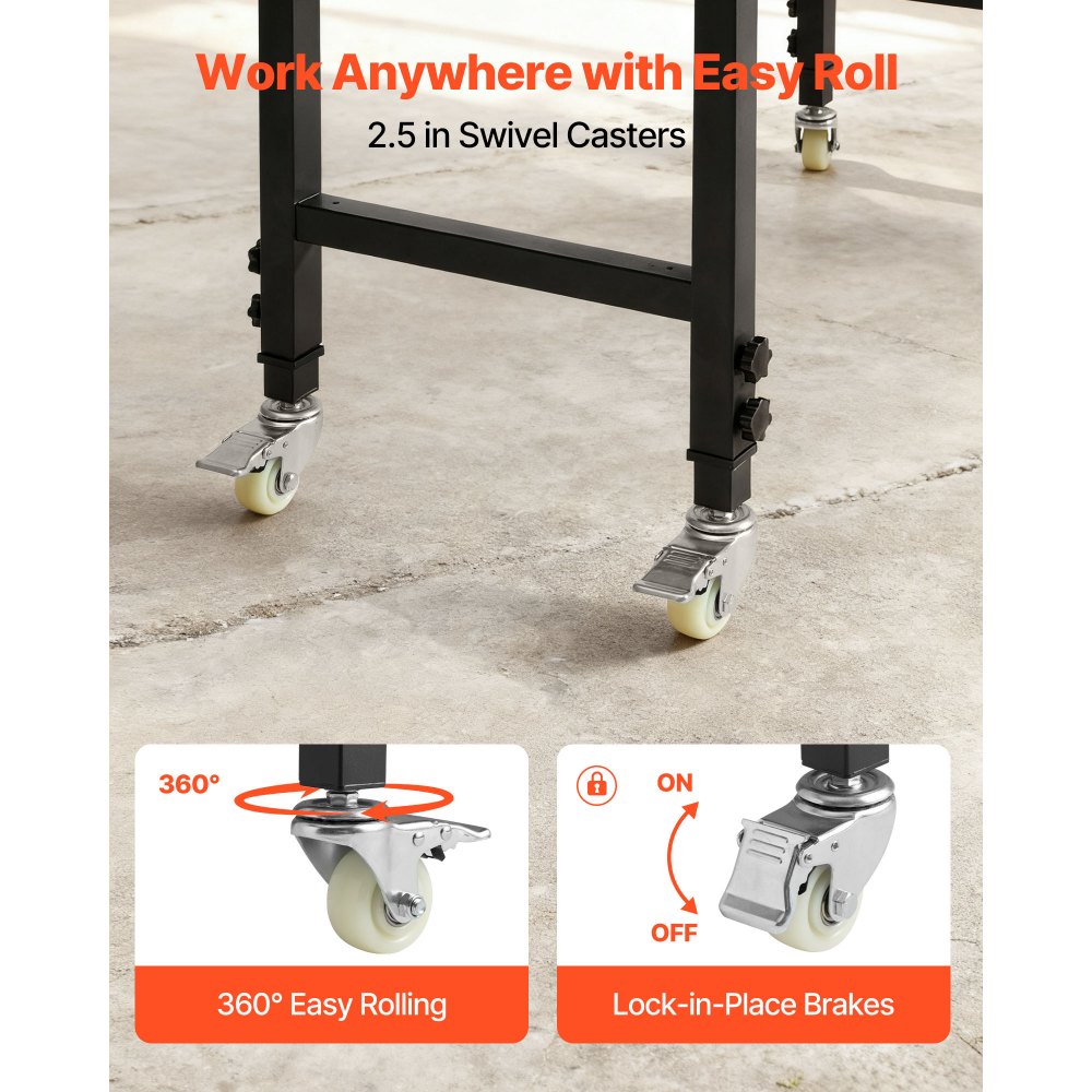 Banco de trabajo resistente con capacidad de 680 kg: Esta mesa de trabajo ajustable ofrece una superficie de 122 x 60 cm y soporta hasta 680 kg. Podrá organizar herramientas y realizar tareas de corte, perforación o almacenamiento pesado con total seguridad