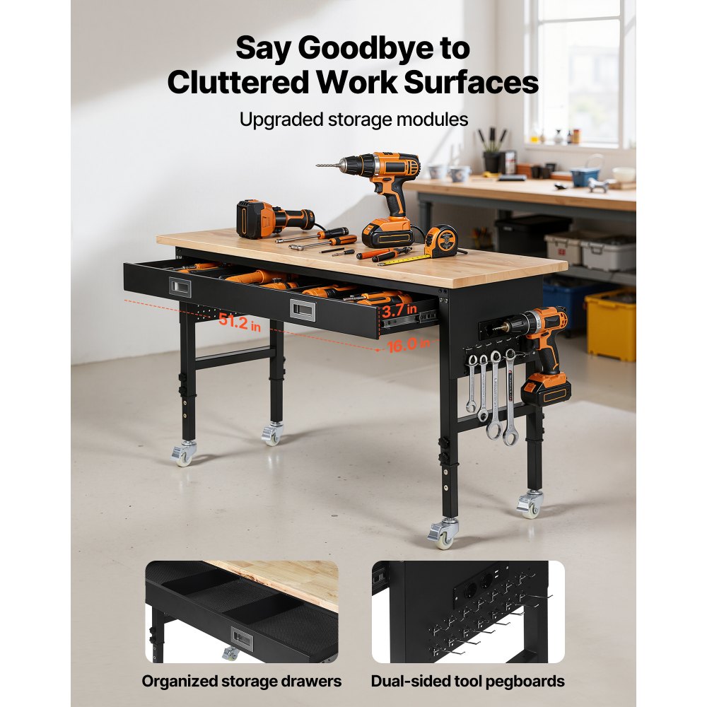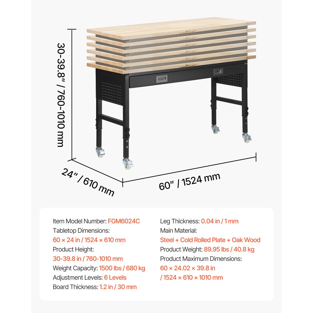 Banco de Trabajo con Cajón 152,4 x 61 cm, Mesa de Taller Altura Ajustable de 6 Niveles de 76-101 cm, Carga de 680 kg, Mesa de Madera Marco de Metal con Ruedas para Oficina, Garaje, Taller - Equipos de almacenamiento y manipulación