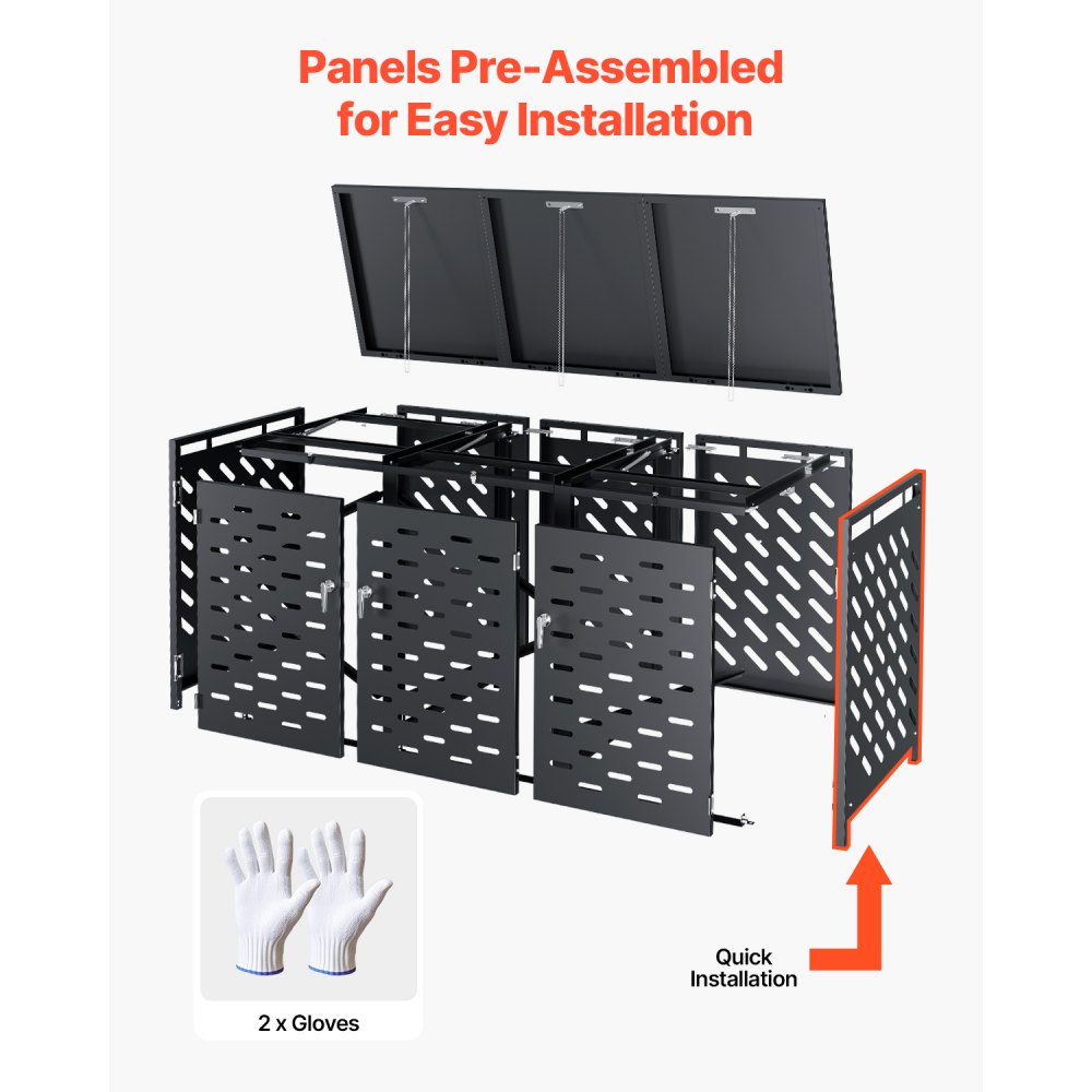Montaje fácil y rápido: Los paneles de nuestro cobertizo de almacenamiento de basura de metal vienen preensamblados para facilitar el envío, lo que simplifica el proceso de ensamblaje. Dos personas pueden completar rápidamente la instalación y también viene con dos pares de guantes protectores para proteger las manos de los instaladores