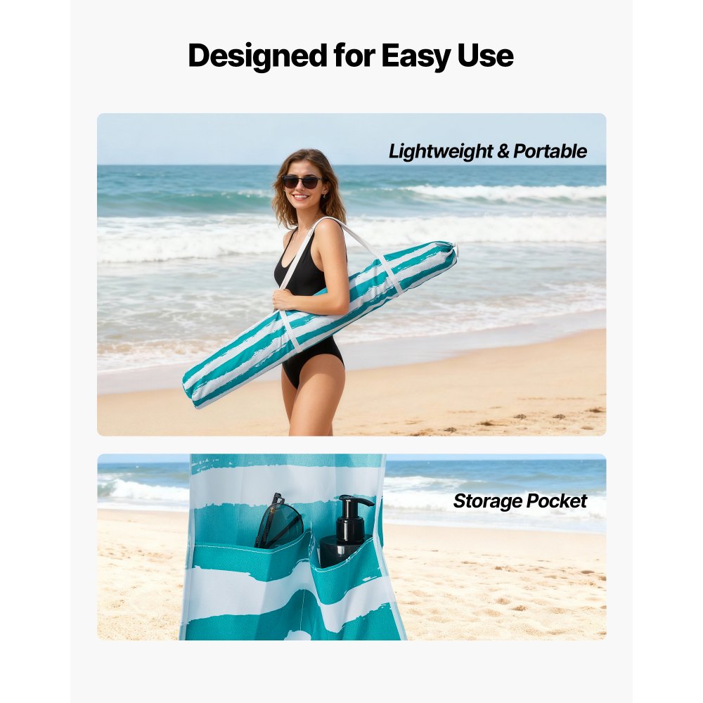 Resistencia al viento: Equipada con una robusta estructura de fibra de vidrio, un mástil principal atornillable, sacos de arena y anclajes al suelo, esta amplia caseta de playa se mantiene firme en la arena. Resiste el derrumbe y la voladura, incluso con brisas marinas suaves