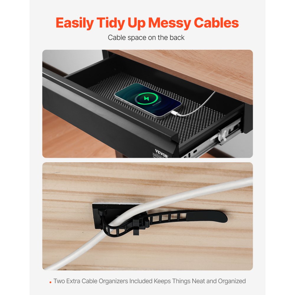 Conexión sencilla de dispositivos: El cajón extraíble cuenta con orificios para cables en la parte posterior, ideales para guardar dispositivos que necesitan energía. Mantenga su escritorio ordenado colocando dispositivos en el interior y pasando los cables por el orificio. Además, dos organizadores de cables ayudan a asegurar los cables debajo del escritorio, lo que mantiene su espacio de trabajo ordenado y organizado