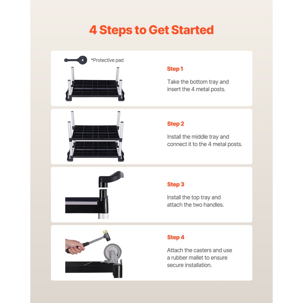 Montaje rápido: Con instrucciones claras, montar este carrito utilitario con ruedas es rápido y fácil, lo que lo hace ideal para usar en el garaje, la oficina o el hogar para organizar y transportar artículos