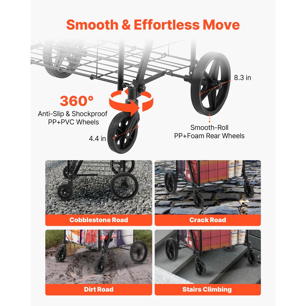 4 ruedas duraderas: Nuestro carrito de compras utilitario con 4 ruedas giratorias industriales de PP asegura un movimiento suave, incluso cuando está completamente cargado. La rueda delantera giratoria de 360° permite cambios de dirección fáciles, mientras que la rueda trasera de 7,3" de diámetro permite que el carro se deslice sin esfuerzo sobre superficies planas o grietas.