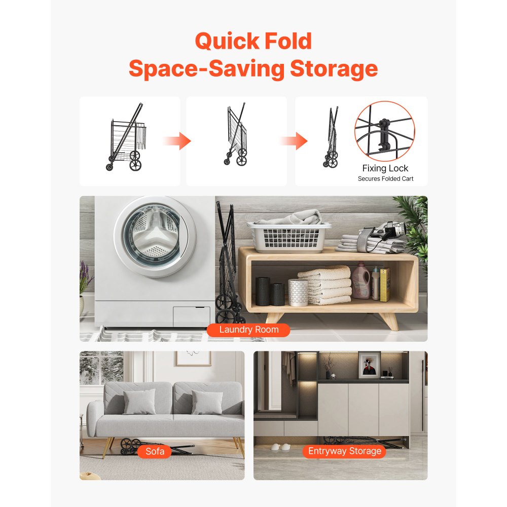 Diseño compacto y plegable: El diseño portátil hace que el carrito de compras plegable sea fácil de plegar en segundos para un transporte y almacenamiento convenientes. Simplemente guárdelo en el baúl, el garaje, el armario, el armario o debajo de la cama sin ocupar demasiado espacio.