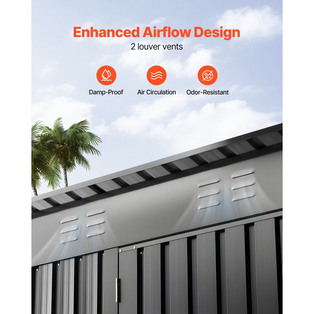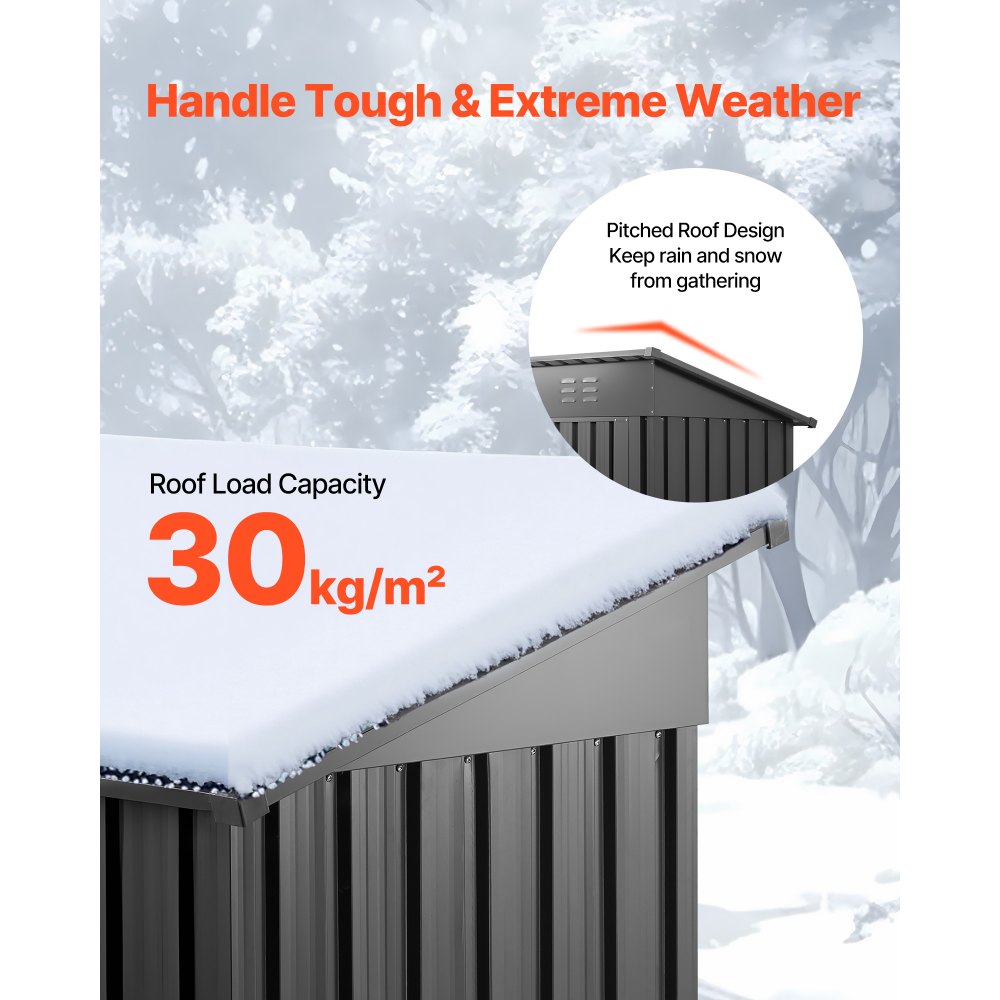Resistente a la nieve y al agua: El cobertizo para herramientas VEVOR cuenta con un techo inclinado que evita la acumulación de nieve y agua. Con una capacidad de carga máxima de 30 kg/m², está diseñado para soportar nieve intensa, agua y suciedad. Disfrute de una solución de almacenamiento para exteriores robusta y duradera