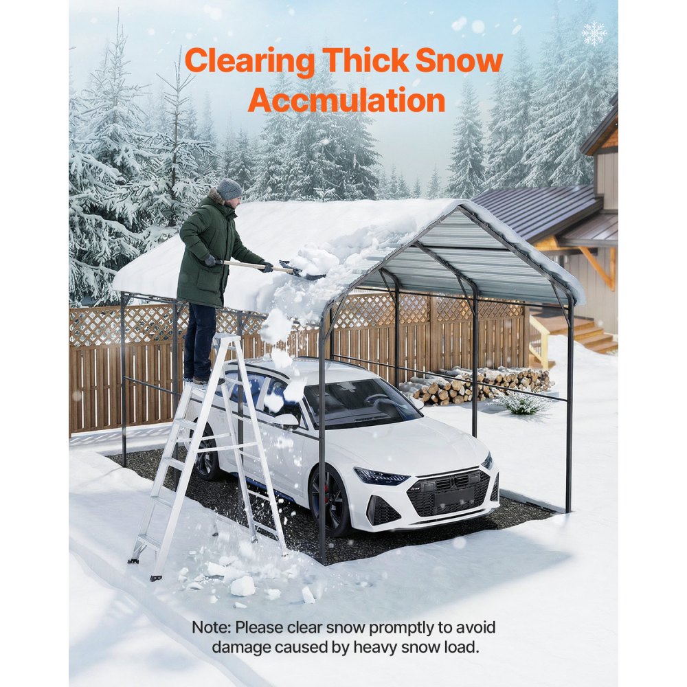 Techo resistente: El techo está hecho de acero galvanizado, lo que brinda protección duradera. Está equipado con cinta de sellado de alta densidad mejorada para evitar filtraciones por lluvia, lo que lo hace excelente para soportar condiciones climáticas adversas. Con una capacidad de carga de techo de 35 lb/ft², esta cochera con techo de acero es ideal para proteger sus vehículos y equipos de los elementos.