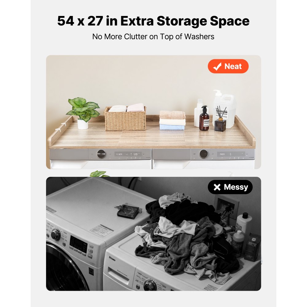 Soporte estable: Nuestra encimera para lavadora y secadora mide 137 x 69,9 cm para adaptarse a la mayoría de las lavadoras y brindar espacio para las tareas de lavandería, el borde elevado ayuda a evitar que los artículos se caigan