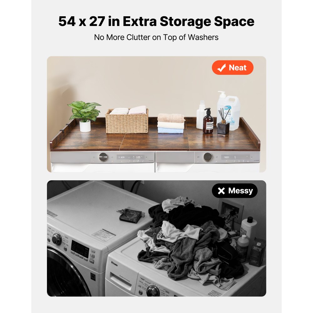 Soporte estable: Nuestra encimera para lavadora y secadora mide 137 x 69,9 cm para adaptarse a la mayoría de las lavadoras y brindar espacio para las tareas de lavandería, el borde elevado ayuda a evitar que los artículos se caigan