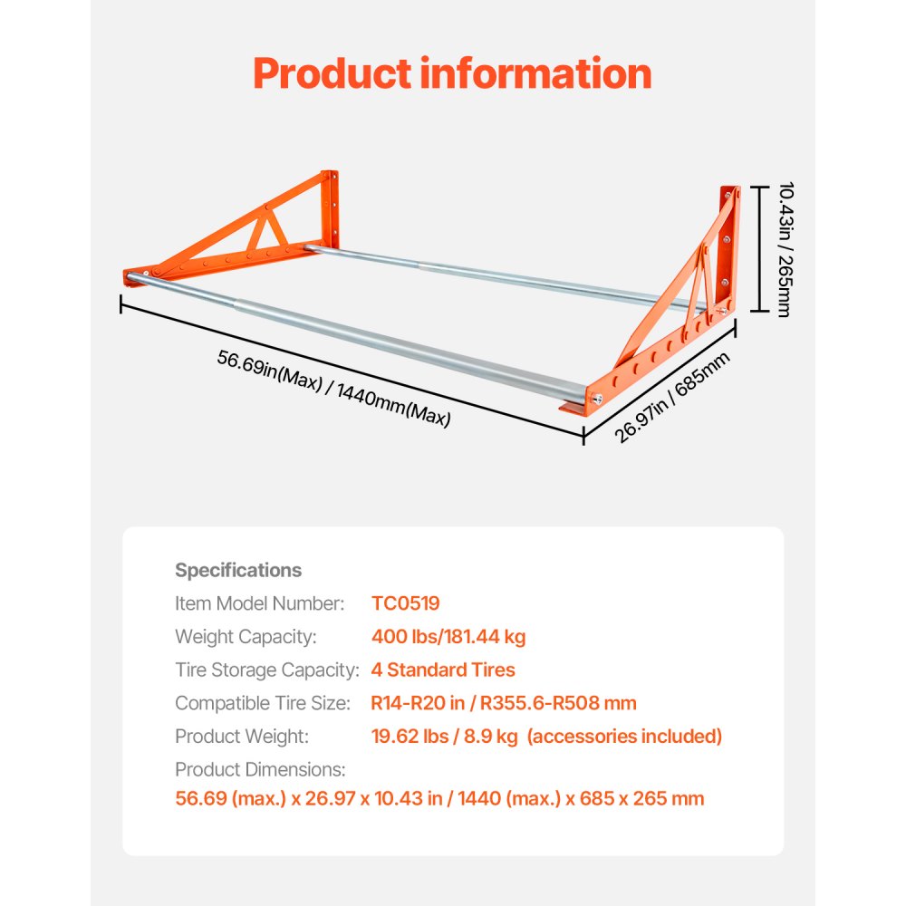 Ajuste de longitud flexible: Las barras de soporte ajustables de este estante para neumáticos montado en la pared se extienden fácilmente de 31 pulgadas a 56 pulgadas, adaptándose a varios tamaños de pared y satisfaciendo sus diferentes necesidades de almacenamiento