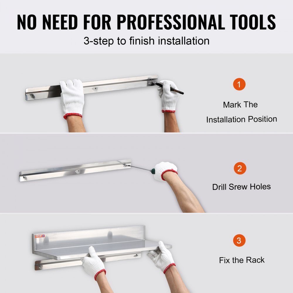 Construcción firme y sólida: Nuestro estante montado en la pared es de acero inoxidable 430, certificado por NSF, lo que garantiza durabilidad y una limpieza más fácil. La superficie presenta un tratamiento cepillado, construido para resistir los rasguños diarios, la corrosión y el deslustre. Así que no se preocupe por las salpicaduras de alimentos y líquidos que arruinan su superficie.