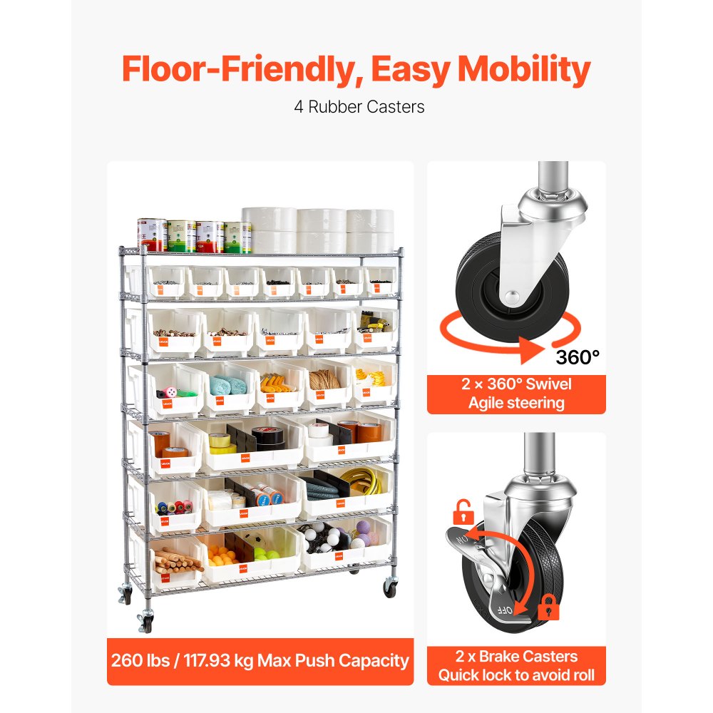 Almacenamiento modular: Este estante con ruedas de 7 niveles y un solo lado incluye 7 contenedores pequeños de polipropileno, 13 medianos y 6 grandes. Cada contenedor tiene una ranura para etiquetas, lo que permite etiquetar, clasificar y encontrar las piezas rápidamente para mantener el espacio ordenado