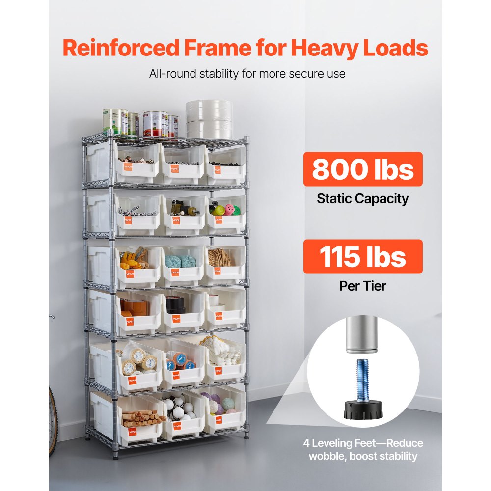Resistente: El estante para contenedores soporta hasta 362 kg estáticos y 50 kg por nivel. Sus cuatro patas niveladoras reducen la inestabilidad y lo mantienen estable en pisos irregulares, asegurando su instalación
