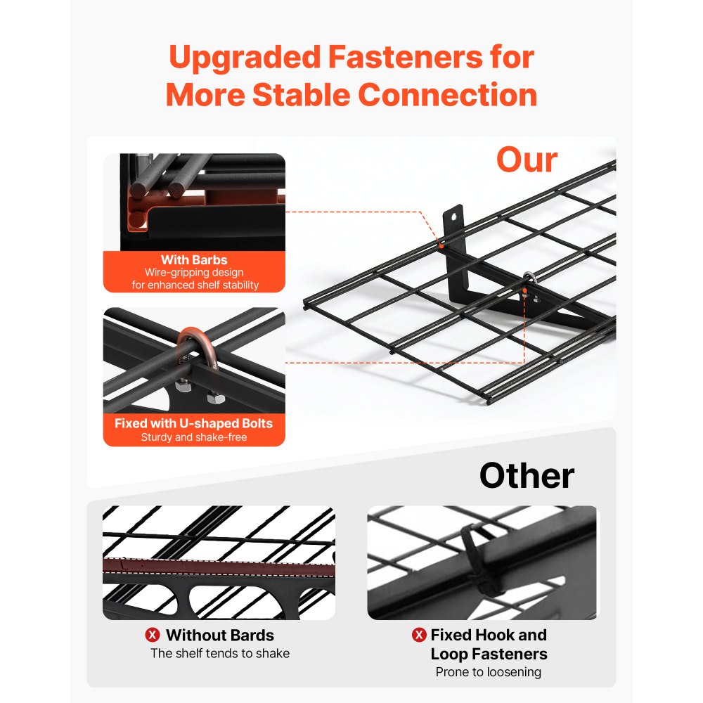 Diseño de suspensión segura: Estos estantes colgantes para garaje utilizan ganchos y pernos en U mejorados para fijarlos firmemente en su lugar. El soporte reforzado ayuda a que todo se mantenga estable durante el uso diario
