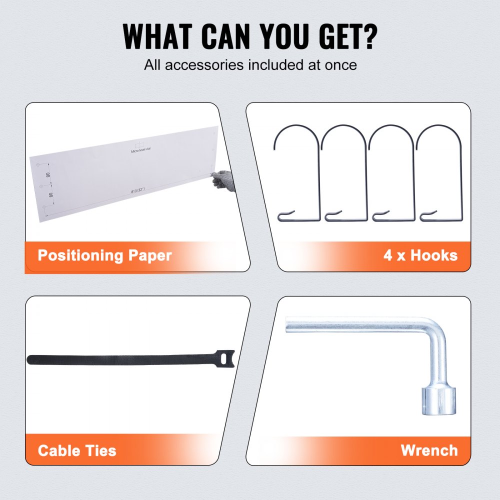 Todo lo que necesitas: El paquete incluye papel de posicionamiento, ganchos, bridas para cables, etc. Este estante de pared para garaje de alta resistencia es adecuado para su instalación en paredes de hormigón o madera. Si se trata de una pared con vigas, verifique la distancia del orificio y no es adecuado para la instalación en paredes metálicas.