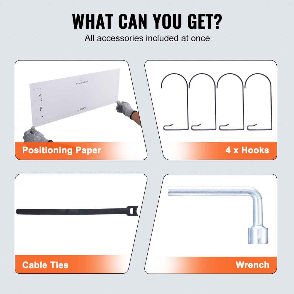 Todo lo que necesitas: El paquete incluye papel de posicionamiento, ganchos, bridas para cables, etc. Este estante de pared para garaje de alta resistencia es adecuado para su instalación en paredes de hormigón o madera. Si se trata de una pared con vigas, verifique la distancia del orificio y no es adecuado para la instalación en paredes metálicas.