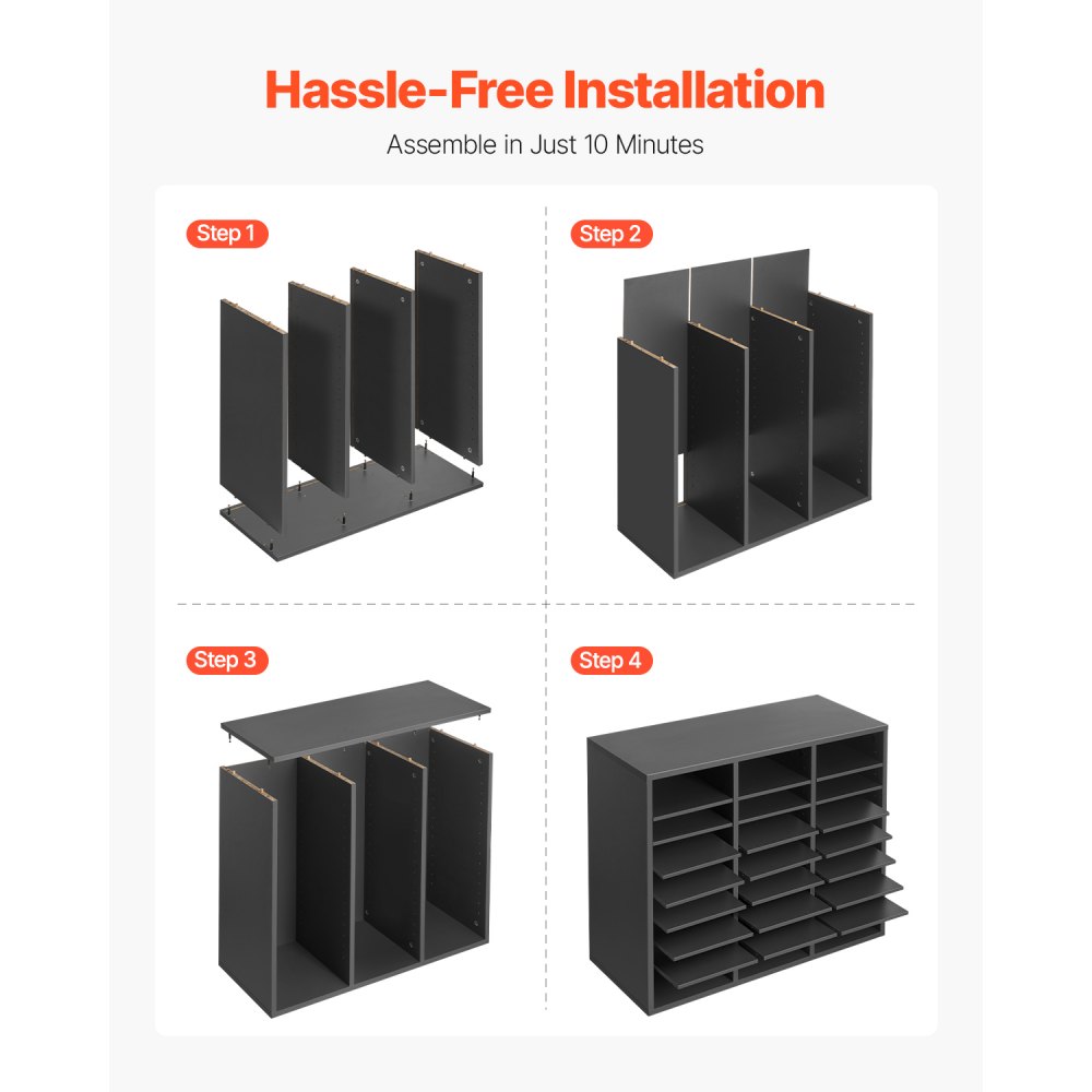 Almacenamiento personalizable: Adapte el buzón de la oficina a sus necesidades. Cada compartimento mide 234 x 282 x 56 mm y puede albergar hasta 500 hojas de papel A4. Con alturas de estantes ajustables que van desde 2,5 a 5,5 cm, puede modificar o quitar fácilmente los estantes para acomodar archivos o suministros de oficina más grandes