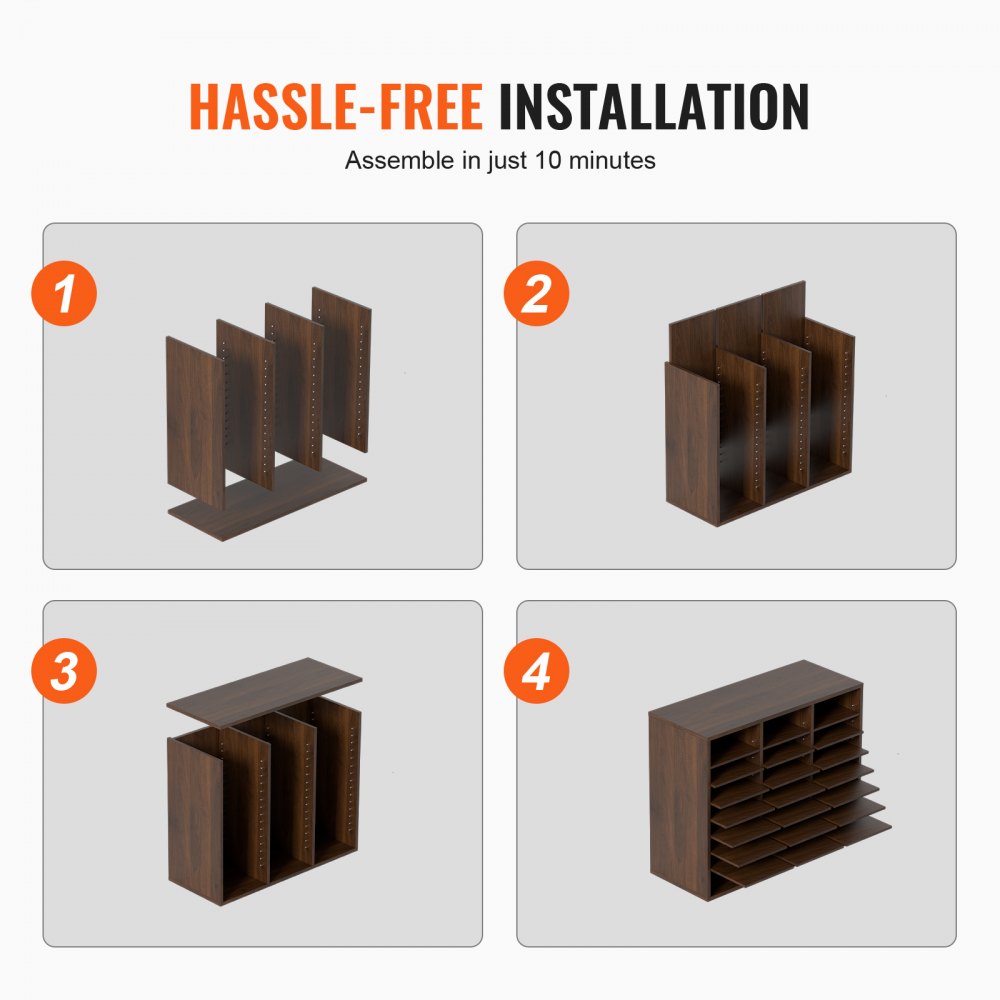 Maximiza su espacio: Diga adiós a los escritorios desordenados con el organizador de literatura de madera de VEVOR de 737 x 305 x 620 mm. Tiene 24 compartimentos en total, dispuestos en 8 filas y 3 columnas. Tendrá un amplio espacio para almacenar y organizar libros, documentos, revistas, papeles y otros materiales. Mantenga su espacio de trabajo limpio y ordenado con facilidad.