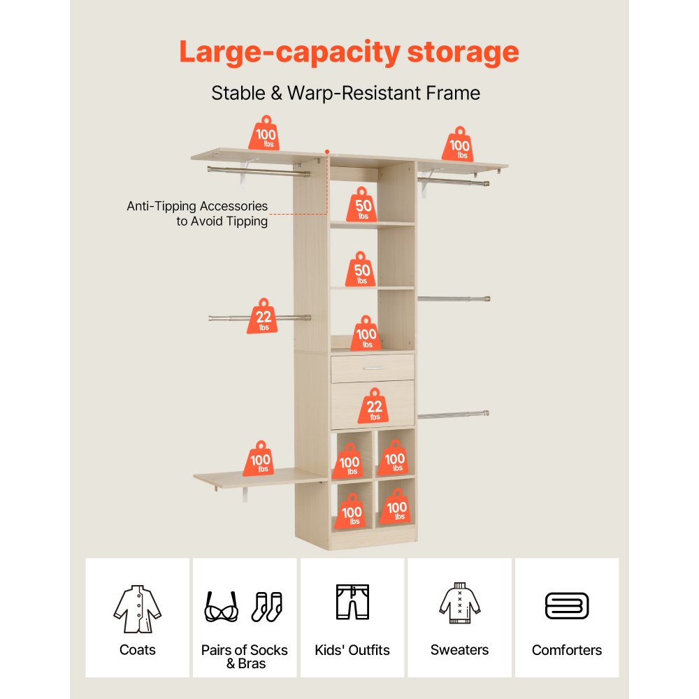 Gran capacidad: Este sistema de armario con cajones soporta hasta 362,7 kg y ofrece espacio para aproximadamente 100 prendas. Usa los compartimentos para separar tus prendas con precisión y mantener todo visible y fácilmente accesible