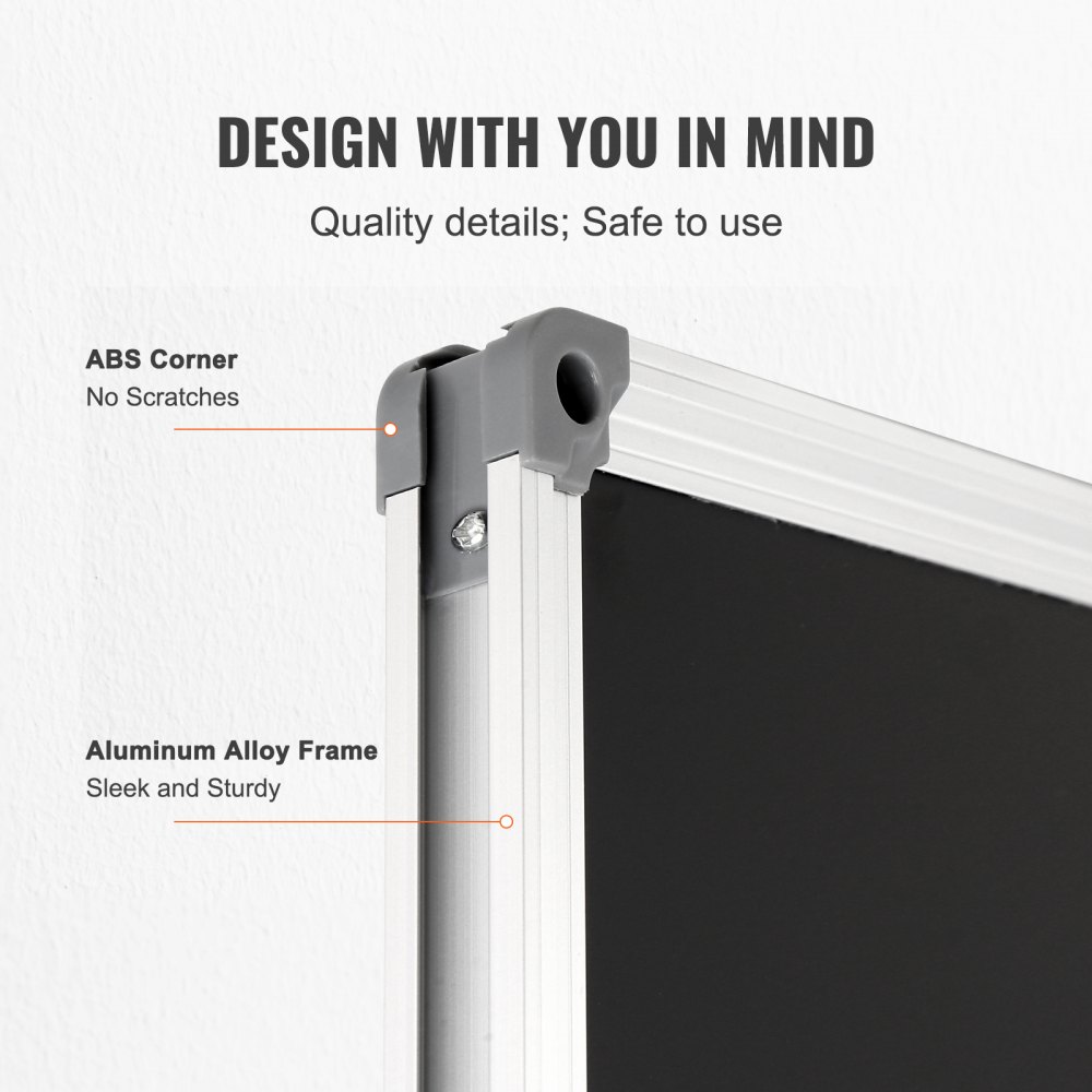 Marco resistente: fabricada con un marco clásico de aluminio plateado, nuestra pizarra no solo es visualmente atractiva sino también excepcionalmente estable. Las esquinas redondeadas de ABS evitan rayones antiestéticos, lo que lo convierte en una opción duradera para uso repetido.
