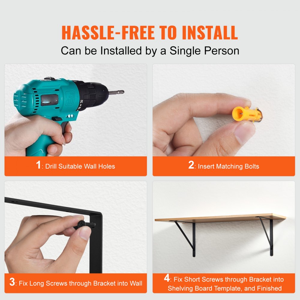 Resistentes y duraderos: los soportes para estanterías están fabricados con un material grueso de hierro fundido con un recubrimiento en polvo negro con textura fuerte, lo que garantiza resistencia a la oxidación, pelado y rayones para un uso duradero.