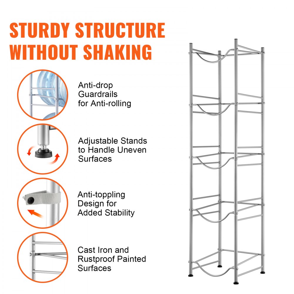 - Soporte para jarra de agua de 5 niveles, soporte para botella de agua de 5 galones, soporte para botella de agua de una sola fila para 5 botellas, soporte resistente para jarra de agua para cocina, oficina, sala de estar, color plateado - Equipos de almacenamiento y manipulación