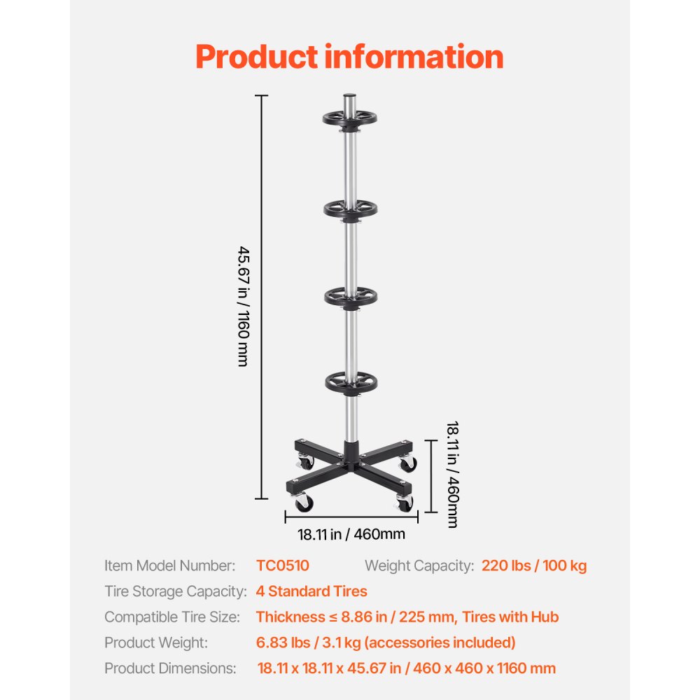 Maximizada eficiencia de espacio: Con 18,11 pulgadas(460 mm) de ancho y 45,67 pulgadas(1160 mm) de alto, este soporte para neumáticos en forma de árbol utiliza el espacio vertical sin ocupar mucho espacio en el piso, lo que ayuda a mantener su garaje, tienda o casa limpia y ordenada