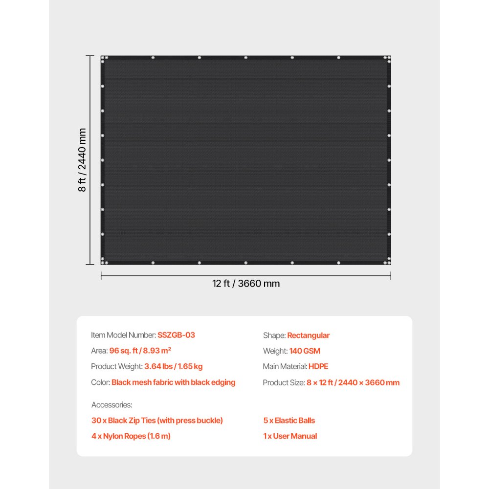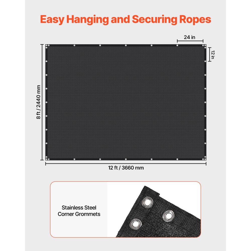 Ojales de acero inoxidable: La malla de sombra mide 2440 x 3660 mm (8 x 12 pies) y está reforzada con ojales de alta calidad. Cada esquina cuenta con 3 ojales, con una separación de 60 cm (24 pulgadas) horizontalmente y 30 cm (12 pulgadas) verticalmente, lo que facilita su instalación y fijación