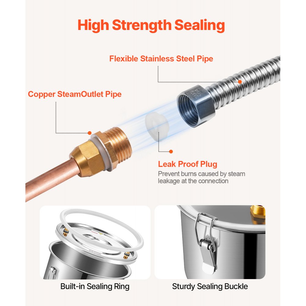 Sellado seguro: Se han añadido tapones de silicona a prueba de fugas en las uniones de los tubos corrugados para evitar fugas de vapor de agua, lo que reduce el riesgo de quemaduras y otras lesiones. Utilice una llave para apretar las conexiones de forma segura durante el montaje. La tapa del barril de fermentación cuenta con cuatro pestillos de sellado fijos con sellos incorporados, lo que garantiza la higiene y unos resultados de fermentación óptimos