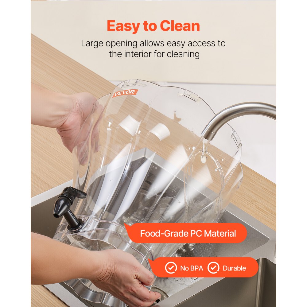 Fácil de limpiar: Fabricado con policarbonato apto para uso alimentario, este dispensador de bebidas grande para fiestas es resistente a las manchas, duradero y apto para lavavajillas. Su tapa extraíble y su amplia abertura facilitan la limpieza del interior