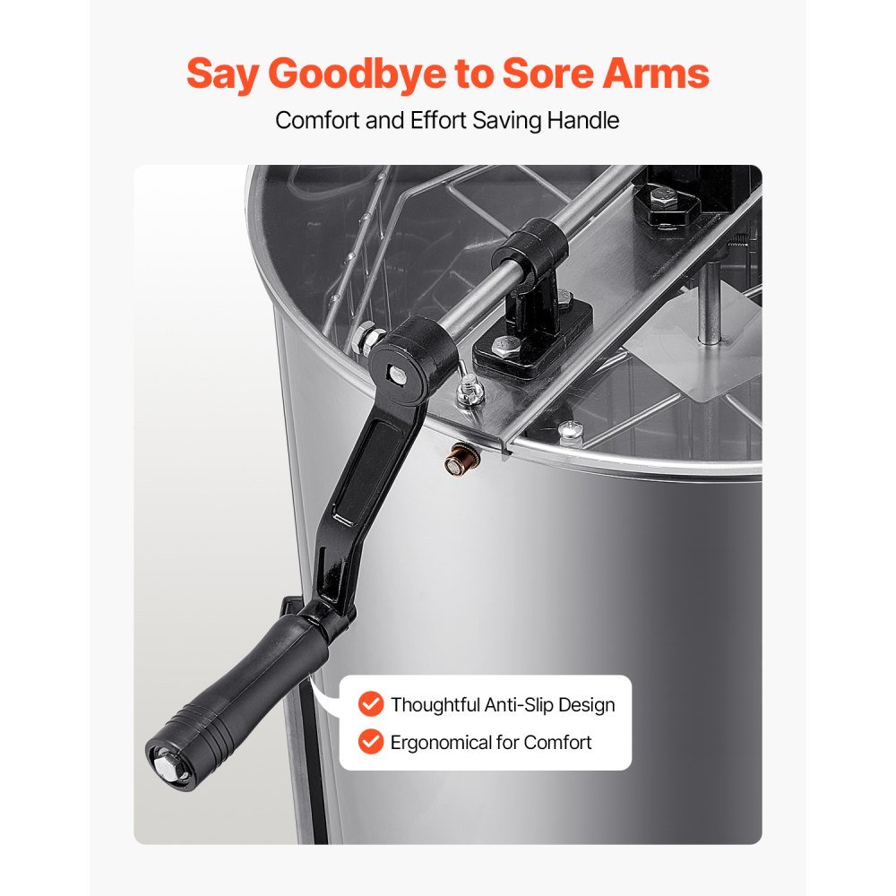 Operación manual sin esfuerzo: El extractor de miel manual cuenta con una manivela ergonómica con un diseño antideslizante que hace que la operación manual sea más cómoda, reduciendo el esfuerzo necesario para la extracción de miel