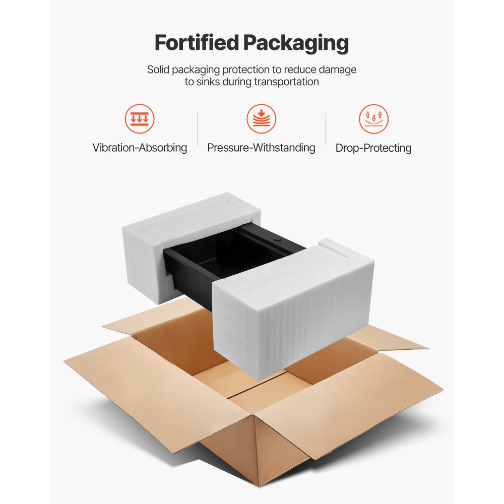 Se entrega completo y sin daños: El fregadero está protegido por cartón de doble pared y espuma EPE, y ha superado las pruebas de apilamiento, vibración y caída. El paquete incluye: 1 fregadero de granito, 1 desagüe, 1 rejilla, 1 estante con ruedas, 1 tabla, 1 kit de piezas, 1 plantilla de agujeros y 1 manual