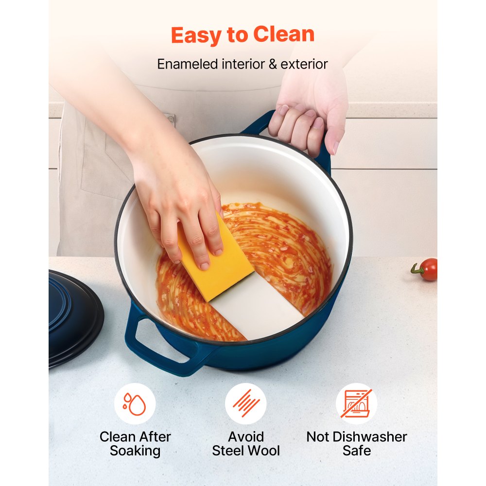 Fácil de limpiar: El revestimiento de esmalte proporciona un acabado antiadherente y facilita la limpieza después de cocinar. Simplemente, limpie la olla con agua tibia y un paño suave. Se recomienda remojarla antes de limpiarla. Para conservar el excepcional revestimiento exterior y prolongar su vida útil, evite usar lana de acero o lavavajillas
