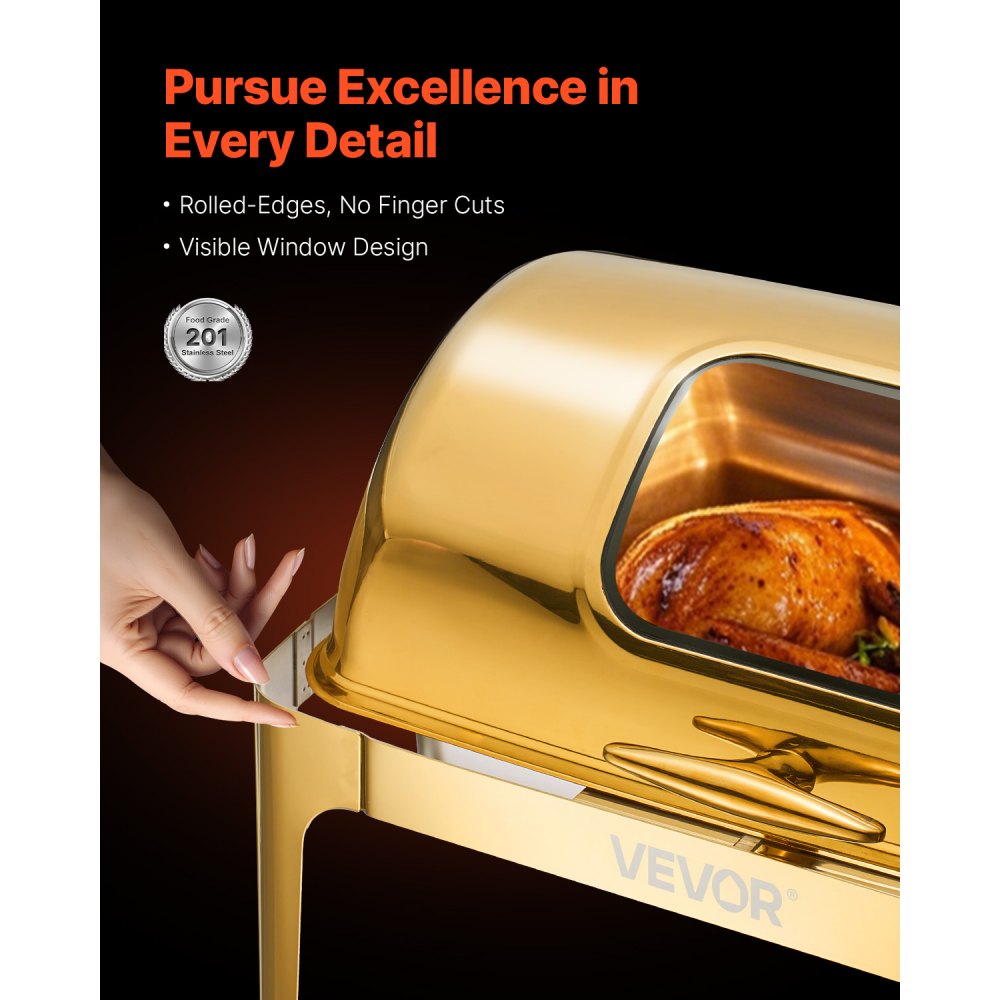 Juego de Calentador de Alimentos Acero Inoxidable con Sartenes Tamaño Completo(8,5 L), Rectangular, con Tapa Visible y Soporte para Bandeja de Agua y Depósito de Combustible, Dorado, 1 ud