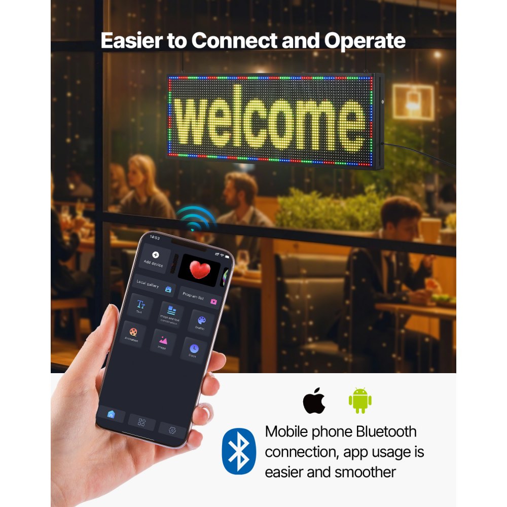 Sistema operativo mejorado: El letrero LED desplazable es fácil de usar: conéctelo por Bluetooth a su teléfono y use la aplicación para editar libremente el contenido publicitario. El manual de instrucciones incluye instrucciones detalladas