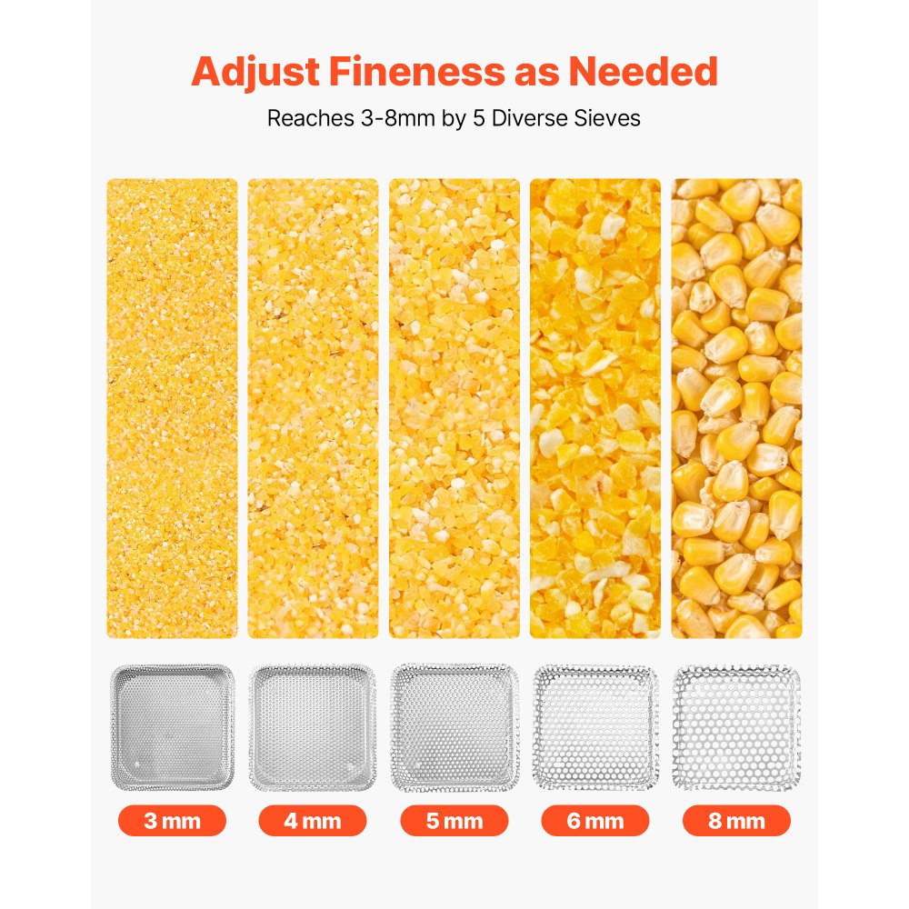 5 pantallas de precisión intercambiables: Equipado con pantallas de 3/4/5/6/8 mm, este molino permite un control flexible del grosor, satisfaciendo las necesidades de molienda de alimento, harina o especias en polvo