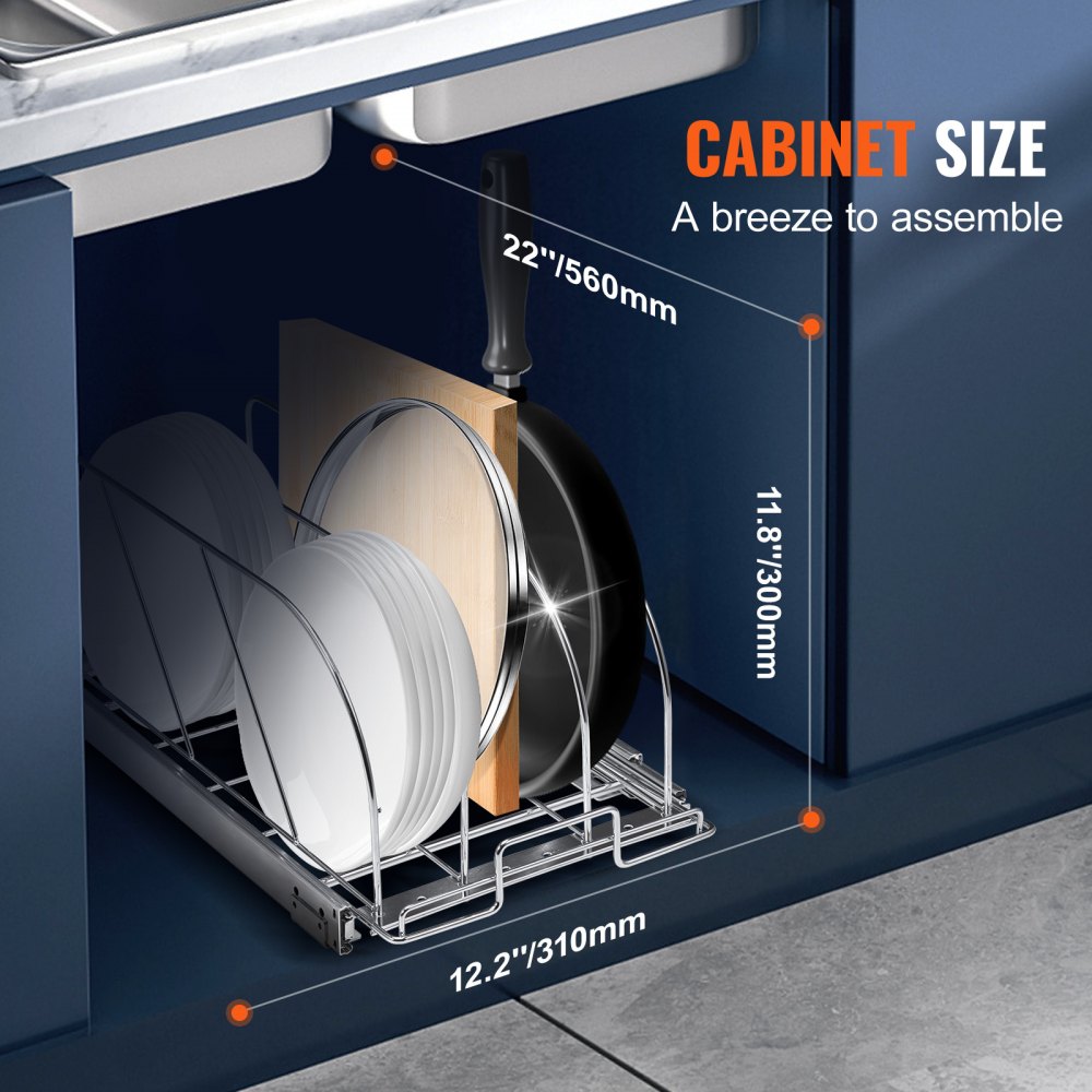 Cajón deslizable de extensión completa: este estante extensible para bandejas y tapas está diseñado con un sistema de rodamientos de bolas de 3 secciones, lo que garantiza un deslizamiento suave y silencioso. Diga adiós a las preocupaciones sobre el bloqueo o la rotura de los medios. Además, soporta sin esfuerzo hasta 121 libras de peso.