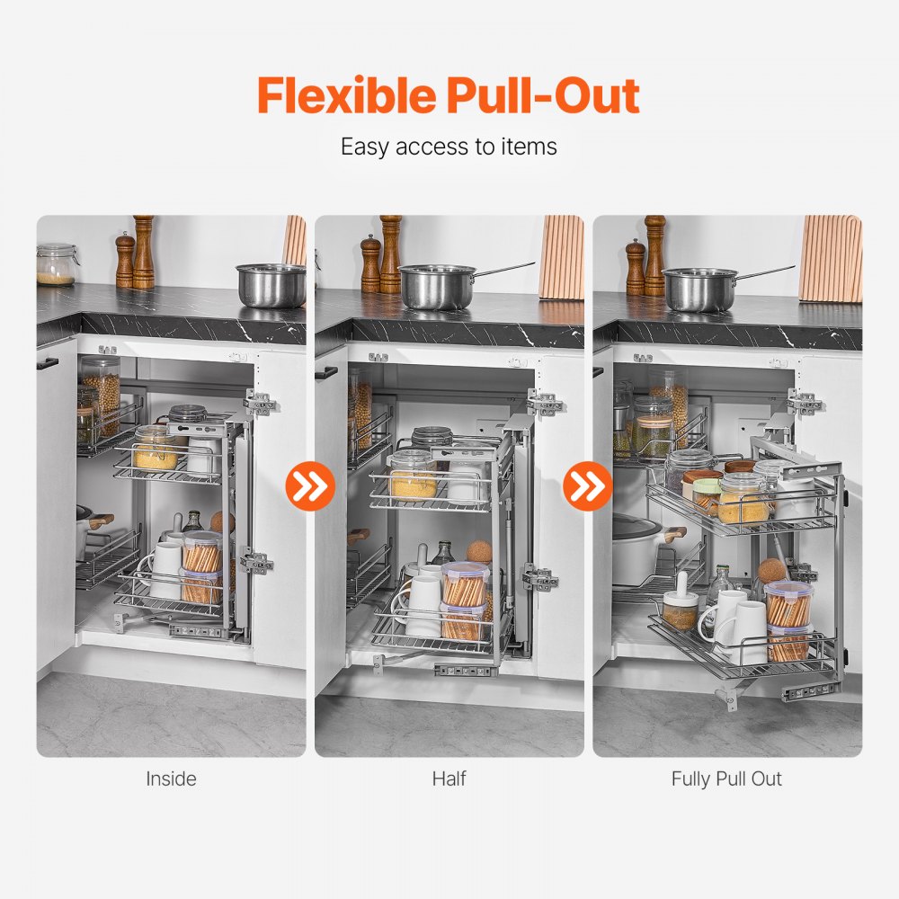 Almacenamiento en puntos ciegos del gabinete: El organizador extraíble para esquinas ciegas presenta un diseño inteligente que aborda los puntos ciegos de las esquinas de la cocina, transformando espacios profundos de difícil acceso en áreas de almacenamiento eficientes y evitando el desperdicio de espacio.