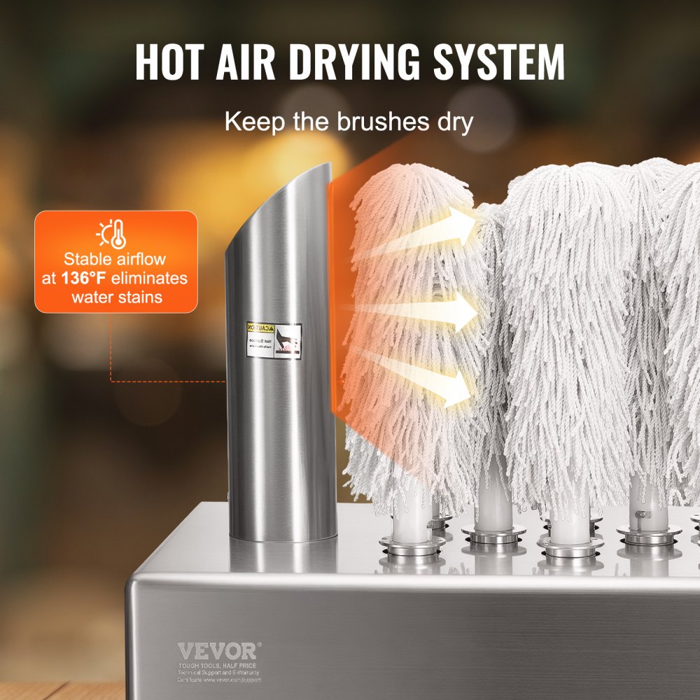 Tecnología de secado con aire caliente: Equipada con un sistema de secado con aire caliente con flujo de aire estable incorporado de 136 °F, esta máquina pulidora evapora rápidamente el agua, eliminando eficazmente las manchas de agua mientras mantiene los cepillos secos para extender su vida útil.