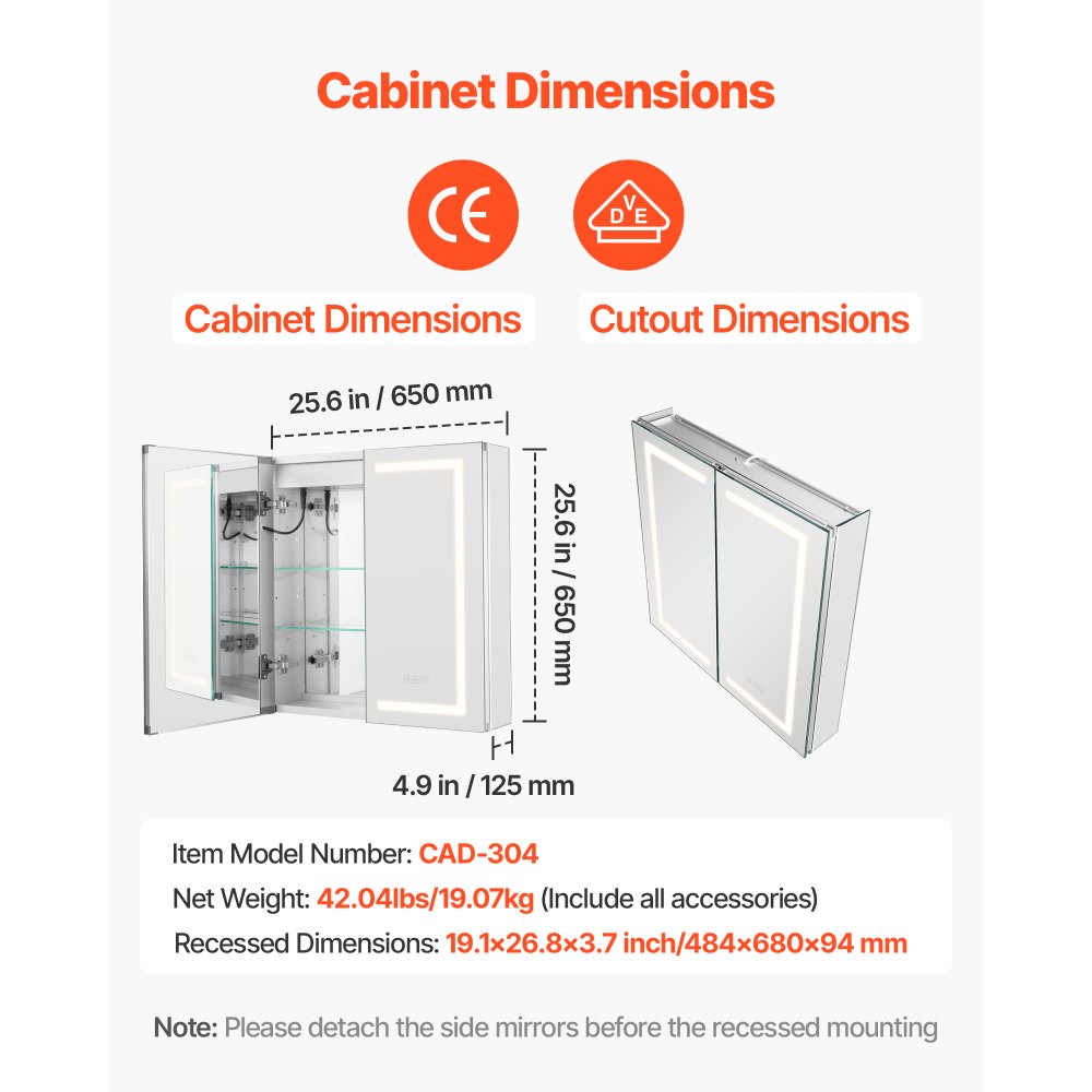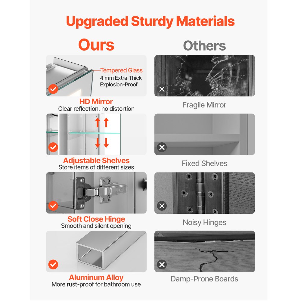 Experiencia mejorada: Nuestro gabinete con espejo LED para baño cuenta con un espejo de alta definición que ofrece reflejos nítidos y sin distorsiones. Cuenta con bisagras de cierre suave para un funcionamiento suave y silencioso, y estantes ajustables para guardar artículos de varios tamaños