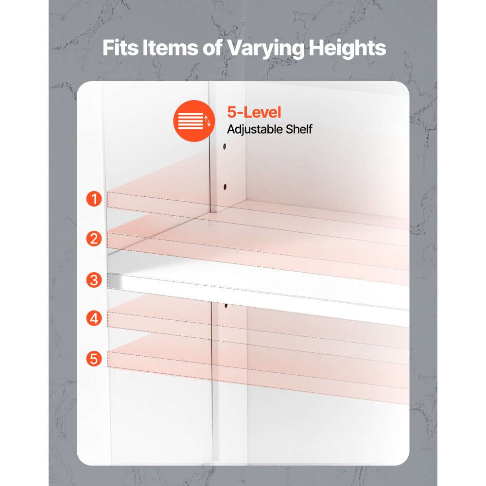 Alturas de estante ajustables: Equipado con orificios pretaladrados, el armario de almacenamiento de piso para baño ofrece cinco niveles de altura para personalizar la separación entre estantes. Es ideal para almacenar artículos de diferentes tamaños con facilidad